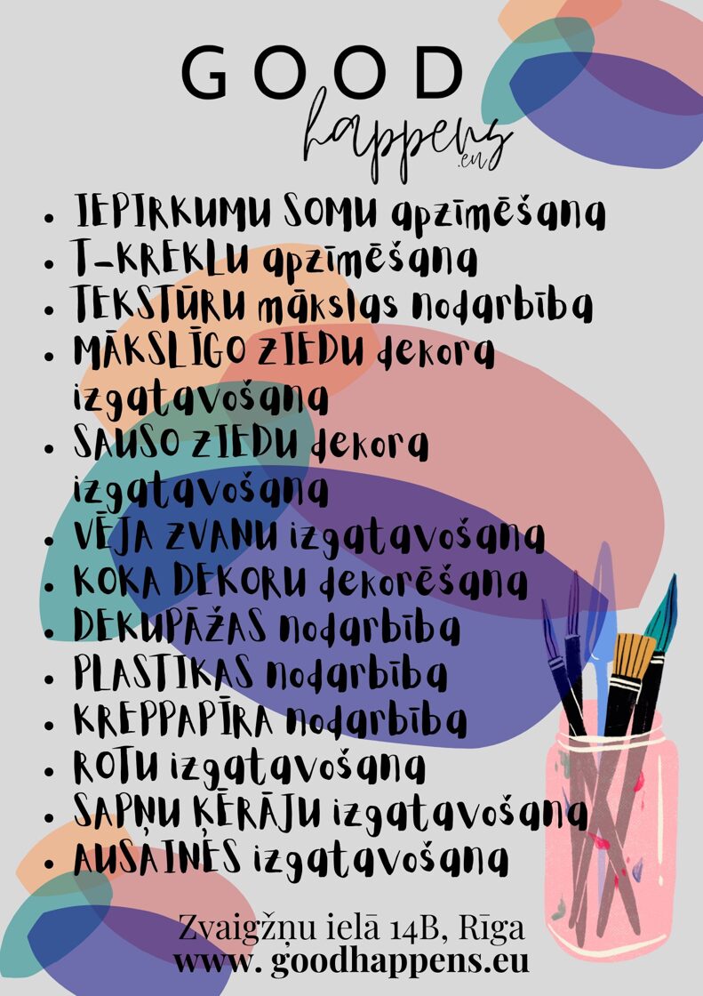 Dāvanu karte ir lieliska ideja, jo dāvanas saņēmējs var pats izlemt un izvēlēties sev piemērotāko radošo nodarbību.Derīguma termiņš: Dāvanu karte ir derīga 6. mēnešus no iegādes datuma.